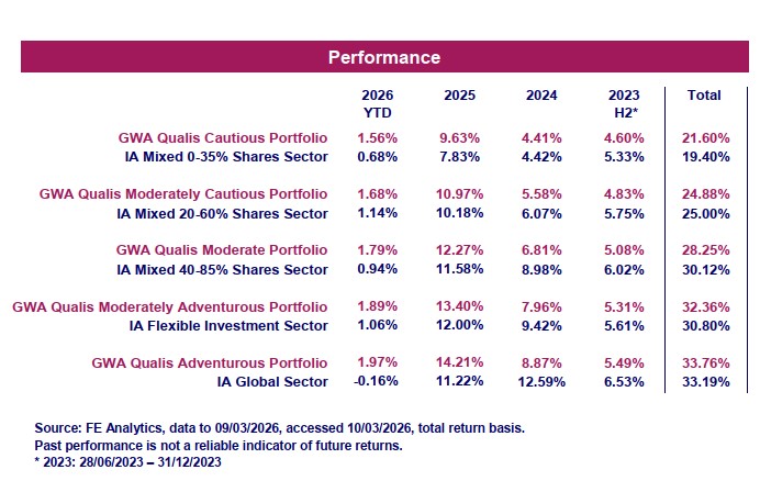 Please note that any performance figures are provided for information purposes only. The performance of your own investments may deviate from the returns shown below due to a number of factors, including product charges, the timing of contributions & withdrawals and portfolio rebalancing. Performance relates to the GWA Portfolios only; if you hold other investments performance will be different.